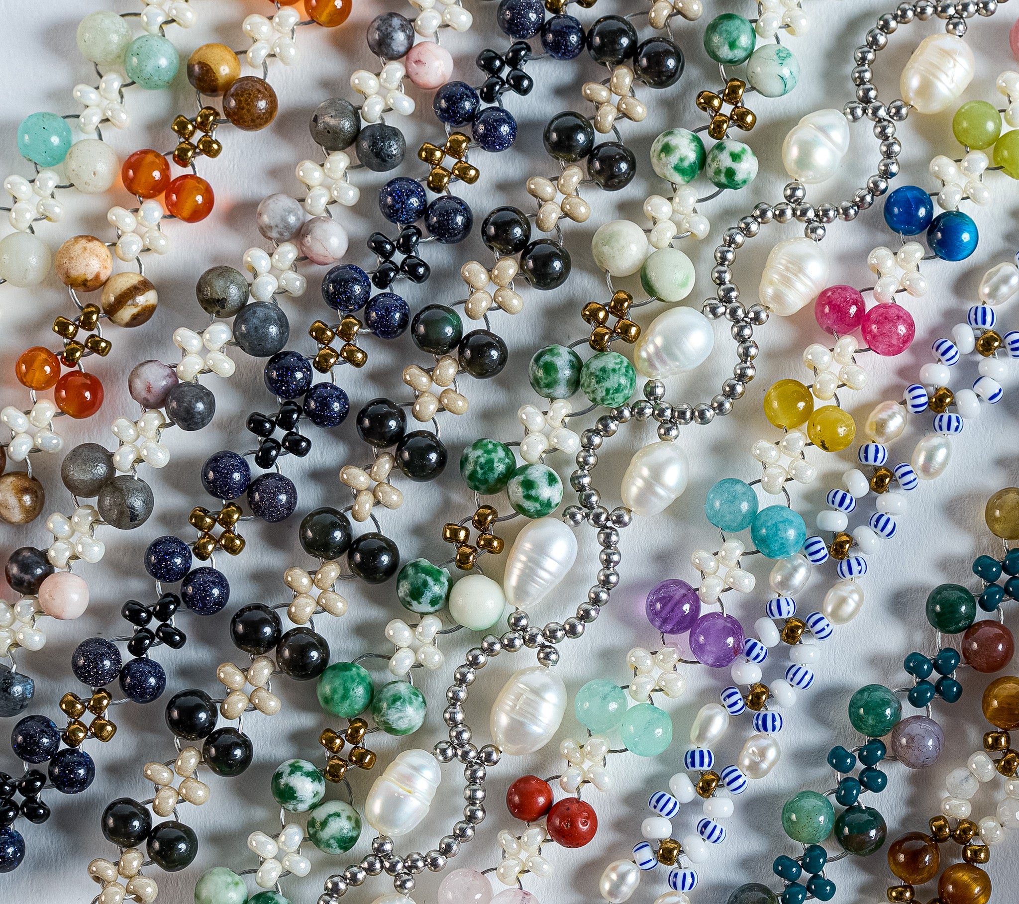 Jedes Schmuckstück entsteht in sorgfältiger Handarbeit. Perlen und Edelsteine werden so kombiniert, dass sie Eleganz und Stabilität vereinen.